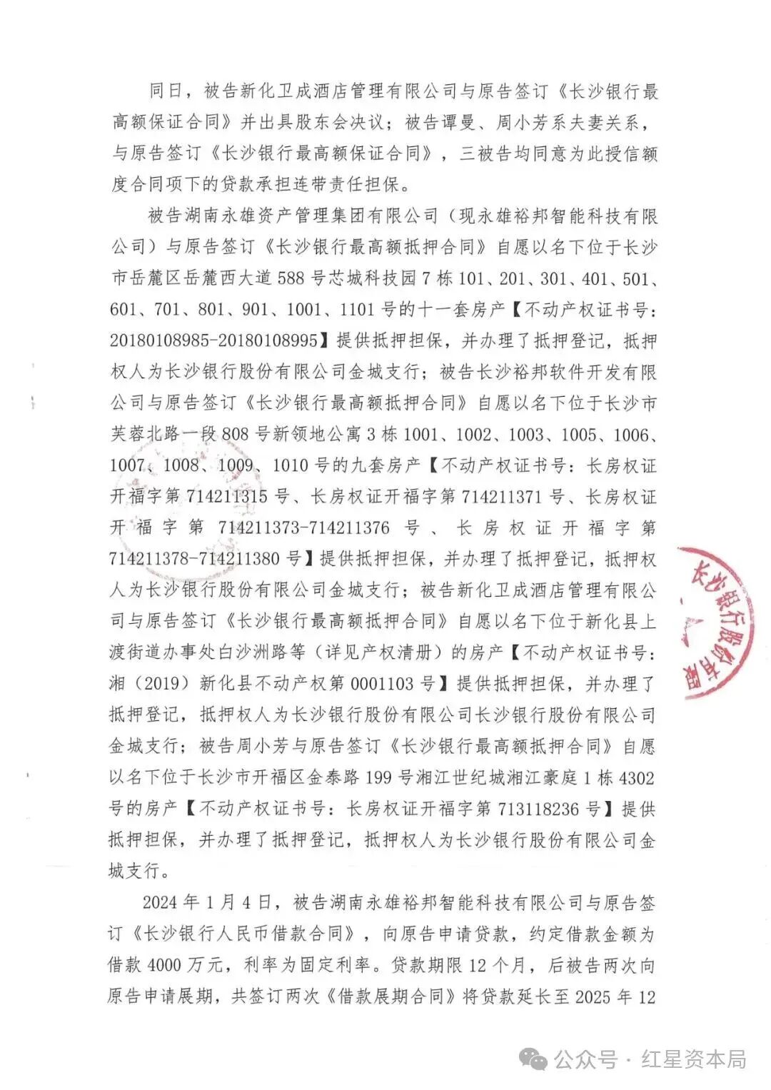 据湖南永雄资产管理集团公众号上贴出的《民事起诉状》显示,长沙银行追讨的这笔贷款源于2023年底签订的最高额度4000万元的授信合同,为获取于2024年初发放的资金,永雄集团及其关联方几乎将所有核心资产作了抵押。