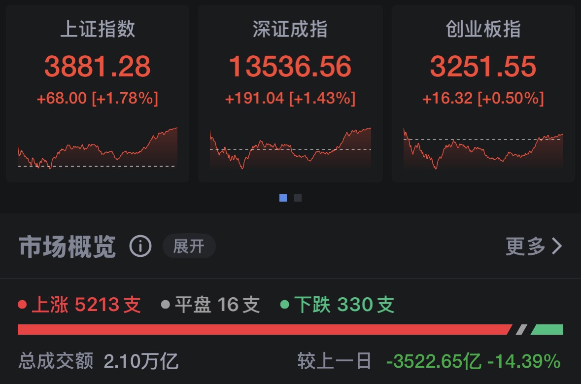 然而今日,A股市场却走出独立行情,四大指数震荡走强。截至收盘,上证指数涨1.78%,收于3881.28点;深证成指涨1.43%,收于13536.56点;创业板指涨0.5%,收于3251.55点,科创综指涨3.24%,报1639.06点。全市场超5100只个股上涨,沪深两市成交额超2万亿元。盘面上,电力、军工、CXO等板块表现活跃,市场呈现普涨格局。