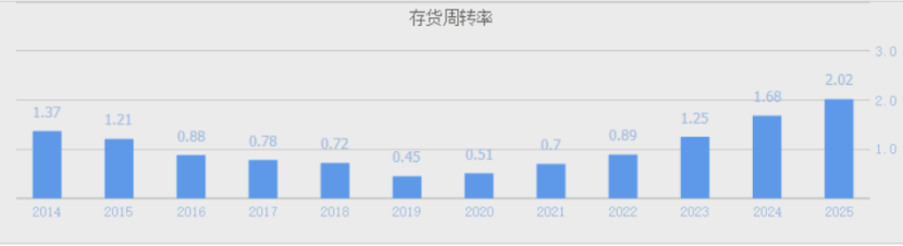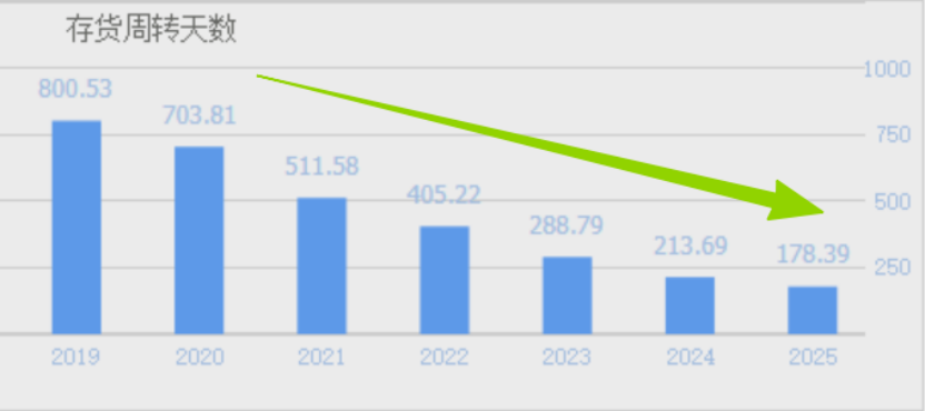 我从公司年报里看到,存货周转率从2020年中报开始逆转,到2025年提升四倍,存货周转天数也从2019年800天减少到2025年的178天,减少超过3/4。