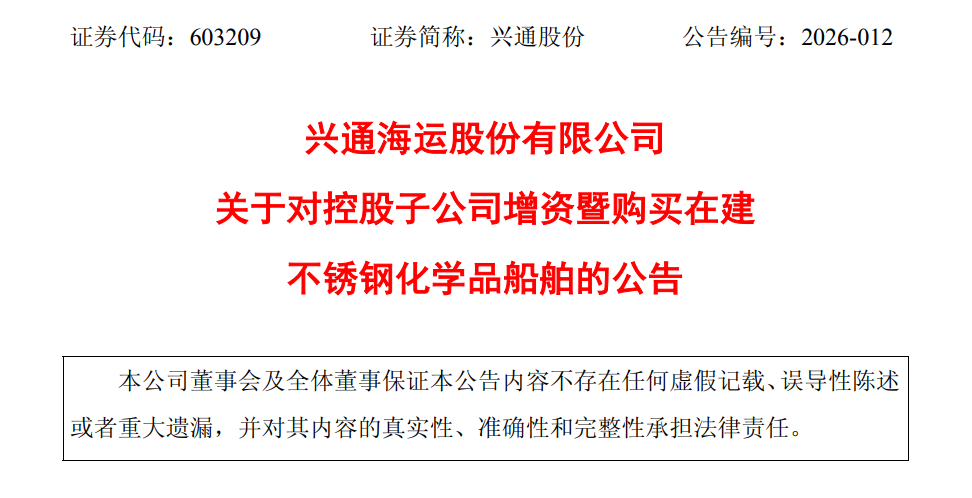 近日,兴通海运股份有限公司(证券代码:603209,证券简称:兴通股份)公告,公司将对控股子公司增资并购买一艘在建不锈钢化学品船舶,以持续推进“1+2+1”发展战略的实施。