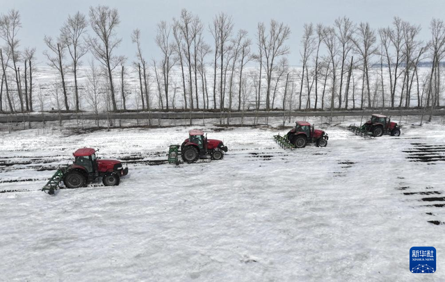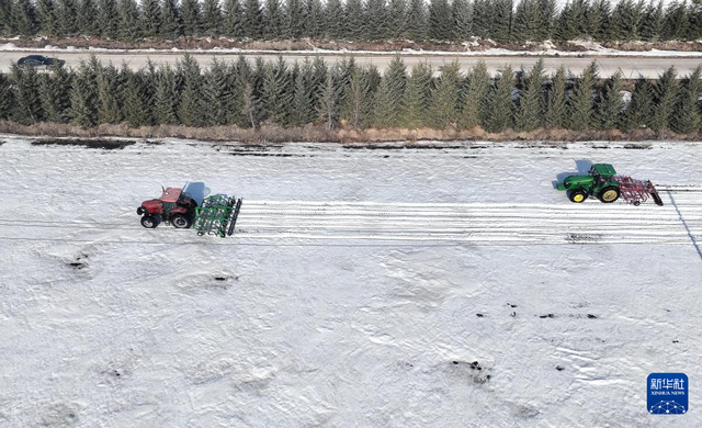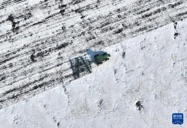 3月24日,北大荒集团北安分公司红星农场有限公司第二管理区有机小麦地块,大马力机车在进行耙雪散墒作业(无人机照片)。 近日,黑龙江垦区北大荒集团部分农业生产单位抢抓农时,组织开展机械耙雪散墒作业,有效提升积雪融化速度,为整地、播种创造有利条件。 新华社发(钱泊羽摄)