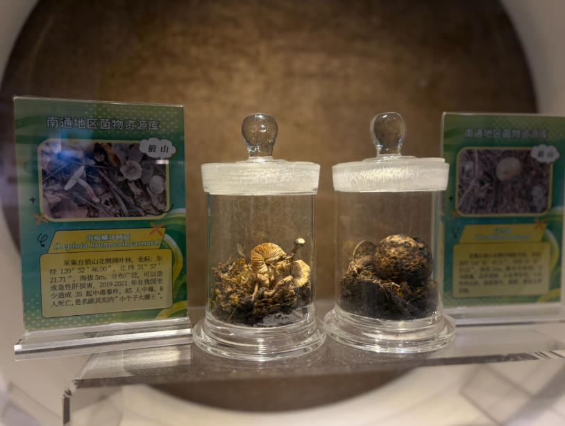 随后,记者跟随黄晨来到了南馆一楼展厅。展柜中,3株蕈菌静静安放——两株是百余年前张謇时期的旧藏;另一株是上世纪九十年代在军山采集的标本。