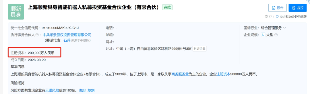 近日,上海顺新具身智能机器人私募投资基金合伙企业(有限合伙)正式成立,总规模达20亿元。