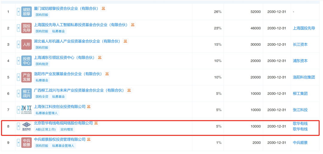 合伙人信息显示,除歌华有线外,还包括厦门斌铠顺擎投资合伙企业(认缴5.2亿元,占比26%)、上海国投先导人工智能私募投资基金(认缴4.6亿元,占比23%)、湖北省人形机器人产业投资基金(认缴3亿元,占比15%)等多家机构。