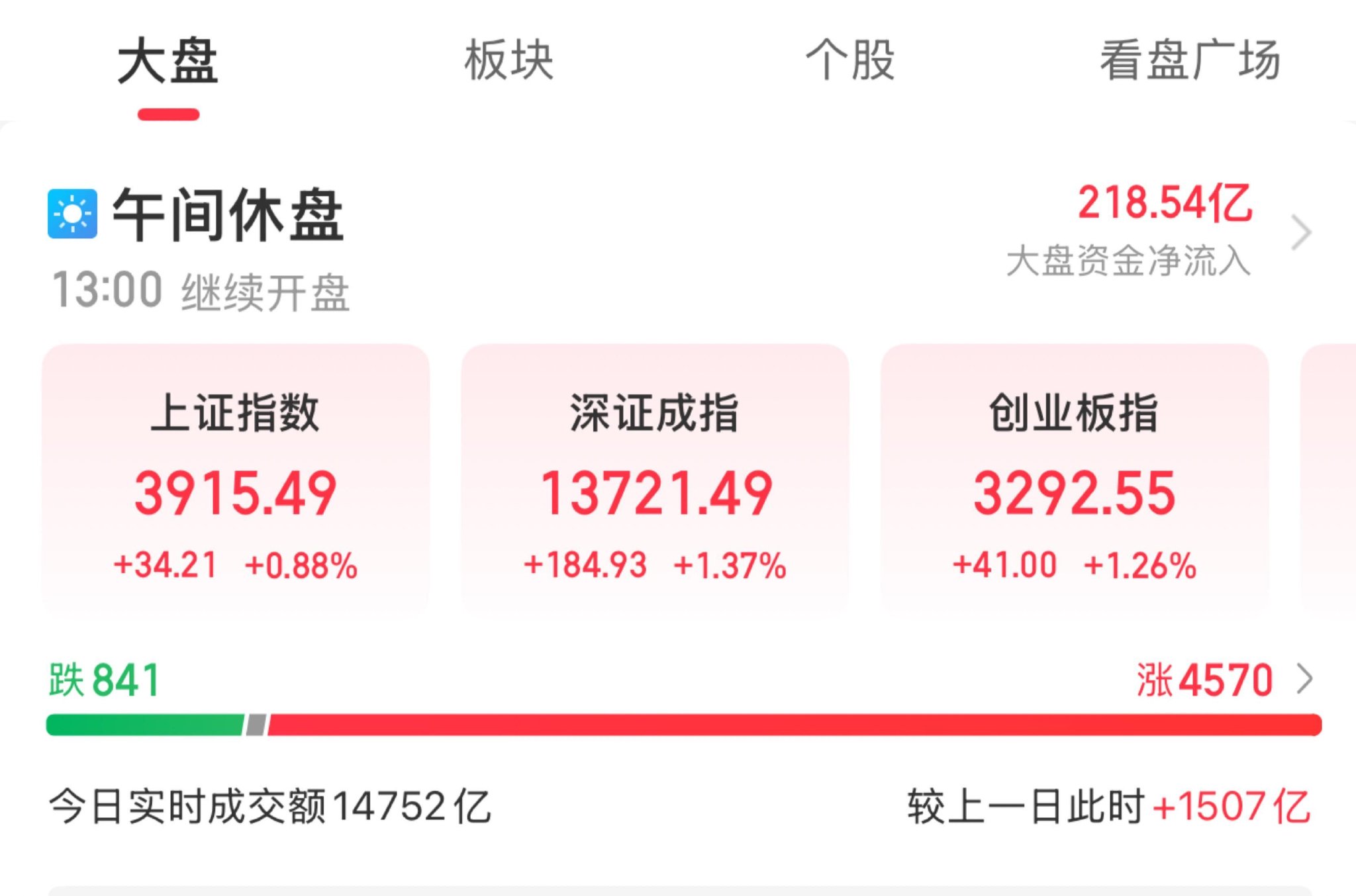 A股三大指数早盘集体上涨,截至午盘,沪指涨0.88%,深成指涨1.37%,创业板指涨1.26%,北证50指数涨1.04%,沪深京三市半日成交额14752亿元,较上日放量1507亿元。全市场超4500只个股上涨。