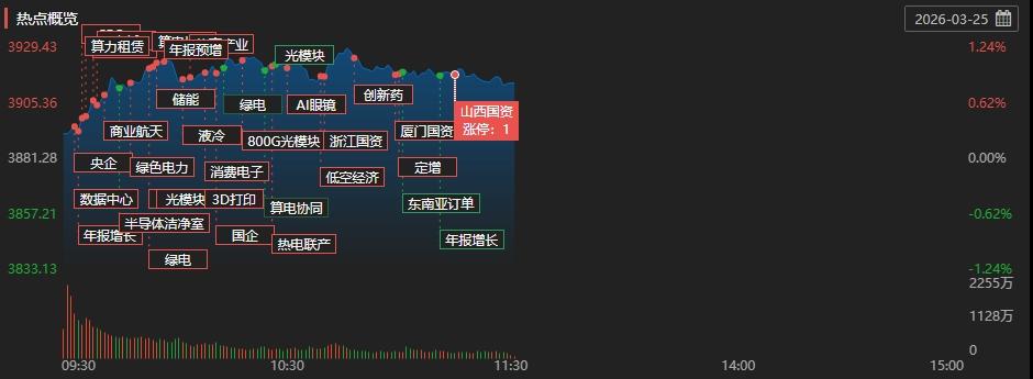 盘面上,“算电协同”概念股继续爆发,华电辽能(600396)录得8连板,晋控电力(000767)、韶能股份(000601)、华电能源(600726)等10余股涨停。招标价飙升引爆光纤反转,相关个股同步大涨,长飞光纤(601869)盘中一度涨停,长光华芯、烽火通信(600498)涨幅居前。中国日均Token调用量突破140万亿,算力租赁板块直接受益,奥瑞德(600666)、利通电子(603629)收获涨停,光环新网(300383)、东方国信(300166)、网宿科技(300017)领涨。此外,CPO、贵金属、教育等多个板块上扬。另一方面,石油天然气板块跟随国际油价回调,通源石油(300164)、洲际油气(600759)、中国海油(600938)纷纷下挫。