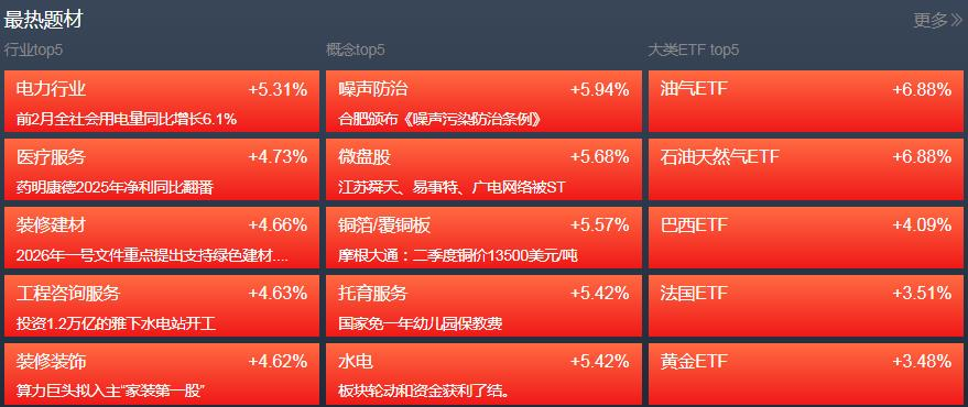 后续热点或继续在受益于地缘因素的油气、化工板块,以及煤炭、电力、新能源等替代性能源板块,与国内政策今年重点支持的半导体、具身智能、算力等科技成长题材,以及基本面较好的内需消费板块之间,反复轮动表现。