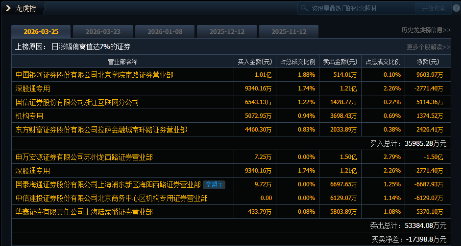 中利集团(维权)(002309)今日涨停,成交额53.69亿元,换手率45.61%,盘后龙虎榜数据显示,深股通专用席位买入9340.16万元并卖出1.21亿元,1家机构专用席位净买入1374.52万元。申万宏源苏州龙西路净卖出1.5亿元。