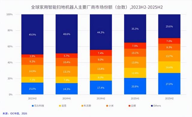 据国际数据公司IDC发布最新的《全球家用智能清扫机器人市场跟踪报告》的最新数据显示,2025年全球清洁机器人市场总出货量达到3272万台,同比增长20.1%;其中扫地机器人依旧是最大品类,全年出货2412万台,同比增长17.1%。