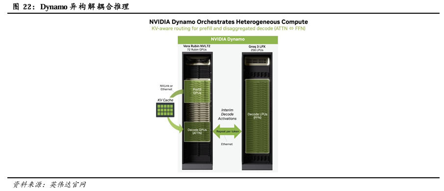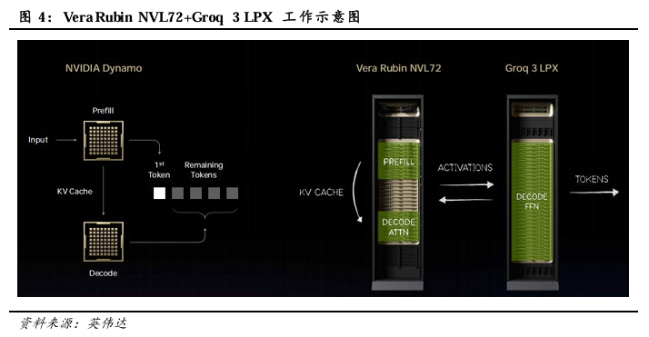 LPU与GPU在分工配比上,英伟达的策略是让Rubin GPU负责预填充阶段,让Groq LPU负责解码阶段。由于LPU本身的存储器容量无法容纳Vera Rubin等级的庞大参数与KV Cache。NVIDIA因此于本次GTC提出“解耦合推理(Disaggregated Inference)”架构,通过名为Dynamo的AI工厂作业系统,将推理流水线一分为二:处理代理型AI时,需进行大量数学运算并储存庞大KV Cache的Pre-fill、Attention运算阶段,交由具备极高吞吐量与巨量存储器的Vera Rubin执行。而受限于带宽且对延迟极度敏感的译码与Token生成阶段,则直接卸载至扩充了巨量存储器的LPU机柜上。