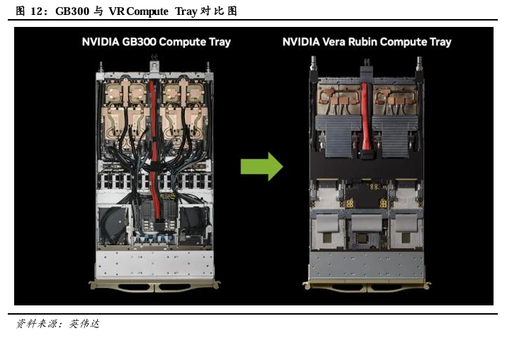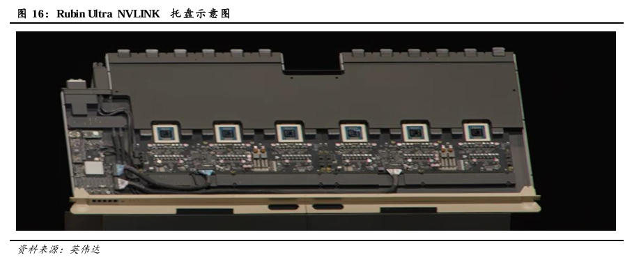 Rubin平台取消托架内部线缆,PCB有望承担更多功能。为提高组装效率,解决传统有线缆托盘在装配与运维中的问题,Rubin平台采用无线缆、无软管、无风扇设计的计算托盘架构。随着托盘内部线缆的减少,PCB有望承担更多功能。