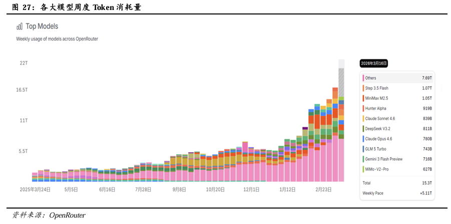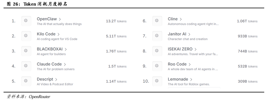 OpenClaw的发布实现了大模型从“对话式AI”到“执行型AI”的范式跃迁,加速Agent AI生态破圈。OpenClaw本地优先架构、跨平台操控、插件化技能支持数千种扩展能力,以及其具备长期记忆和主动任务执行能力等创新设计,使其做到能真正接管用户电脑、自动调用工具完成复杂任务,像一个24小时在线的“数字员工”,精准击中了市场对“能干活AI”的刚需,因而一经发布2026年初即实现爆火,迅速从极客圈破圈至全民热潮,跃升为全球范围内Token消耗最高的应用。根据AI模型聚合平台OpenRouter数据,截至2026年3月21日,OpenClaw Token当月消耗量达到13.2万亿,成为该平台Token消耗最高的应用。