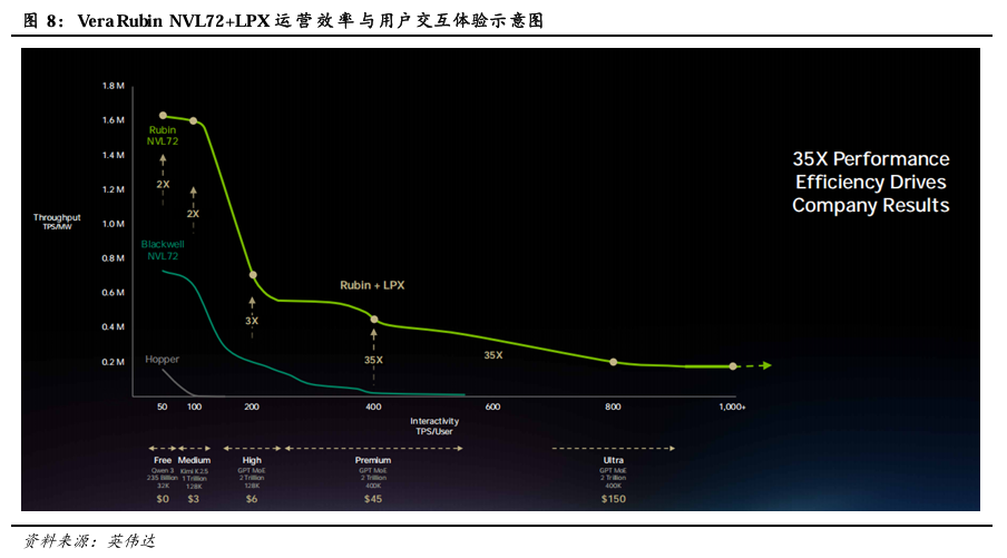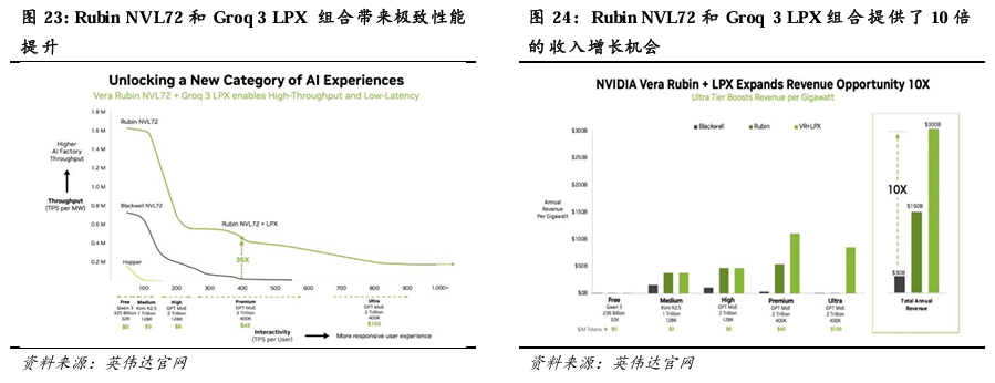Groq 3 LPX进一步提高Vera Rubin NVL72的TPS/MW表现,并开拓更高TPS/User市场。通过Vera Rubin NVL72与LPX的异构协同架构,GPU提供高带宽 HBM4 内存与强大计算,LPX 则专注 SRAM 驱动的超低延迟解码,系统在高 TPS/user场景下的TPS/MW曲线下降速度放缓。Vera Rubin NVL72+LPX在Premium场景下的TPS/MW表现达到Blackwell的35倍,远超单独使用Rubin时的10倍;并进一步拓展了Ultra(2Trillion 参数大模型 + 400K 超长上下文,达到800 TPS/User)场景,有望实现每月约150美元的收费。得益于此,每 GW(吉瓦)的Vera Rubin NVL72+LPX AI工厂年营收潜力可达3000亿美元,相当于Blackwell的10倍。