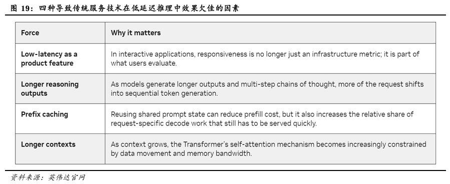 AI正从生成模型跨入代理模型时代,交互式推理成为核心需求,而这也让AI在生成Token的解码(Decode)阶段面临严重的延迟与存储器带宽瓶颈。随着AI从生成模型跨入代理模型时代,其推理范式正经历根本性转变,从以吞吐量为核心的批处理任务,转向对延迟极度敏感的交互式应用。在这一转型中,大模型生成Token的解码阶段成为关键瓶颈。代理型AI需要将复杂目标拆解为多步推理,每一步的延迟都会累积为用户可感知的端到端响应时间,因此稳定的单Token性能和极低的尾延迟至关重要。解码阶段的挑战在于其自回归特性:模型需顺序生成Token,且每次生成都需读取全部模型权重与历史上下文的KV缓存,导致计算量远小于数据搬运量,核心瓶颈从计算吞吐转向了内存带宽。同时,更长的上下文窗口和更高的用户并发进一步加剧了内存带宽压力,并削弱了传统吞吐优化系统所依赖的批处理效率。因此,专为高吞吐设计的GPU架构在解码阶段面临“内存墙”困境,其片外高带宽存储的访问延迟成为制约响应速度的主因。