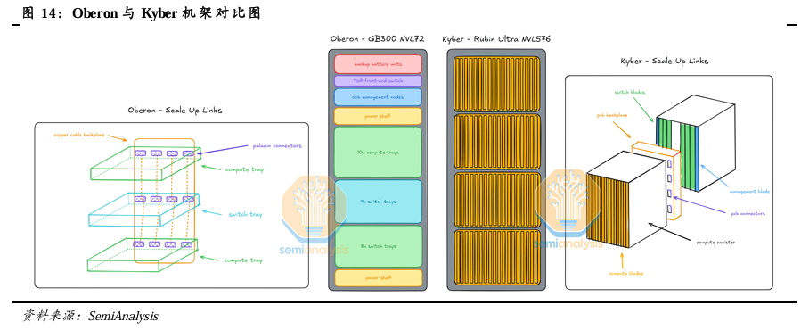 Kyber机架有望使用PCB背板取代铜缆。英伟达在GTC 2025上推出了使用Kyber机架的Rubin Ultra NVL576,Kyber机架与Oberon机架相比,主要有以下区别: