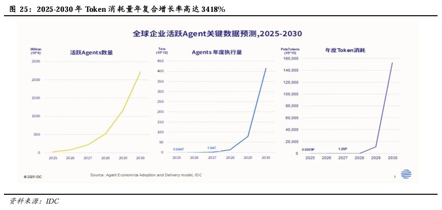 Agent AI的Token消耗量较传统AI应用激增,预计将推动算力需求实现指数级增长。Agent AI 以ReAct推理-行动闭环自主执行复杂任务,推理过程中需拆解目标、多轮调用工具、自我校验与试错,单任务触发多次模型推理,因而其Token 消耗相较于传统AI应用“一问一答”的脉冲式交互,呈叠加式增长;同时,Agent 必须携带完整历史上下文进行每轮推理,上下文随交互轮次指数膨胀,形成“滚雪球”式Token消耗;且其内置心跳/定时任务机制实现 7×24 小时后台静默运行,无用户交互也持续产生隐性Token消耗。此外,Agent 需加载庞大的系统提示词与工具定义,同时多个子 Agent 并行、工具链级联触发进一步放大消耗,最终使单任务 Token 消耗较传统AI大幅跃升。以OpenClaw为例,一个重度“养虾”用户,日均消耗Token在3000万至1亿之间。作为对比,一个普通ChatGPT用户即使天天聊天,月消耗也不过百万级。根据IDC预测,未来五年,全球Agent生态将经历一场指数级的扩张,到2030年,全球活跃AI智能体将达22.16亿,年度Token消耗量将从2025年的0.0005 Peta Tokens飙升至15.3万Peta Tokens,年复合增长率高达3418%。