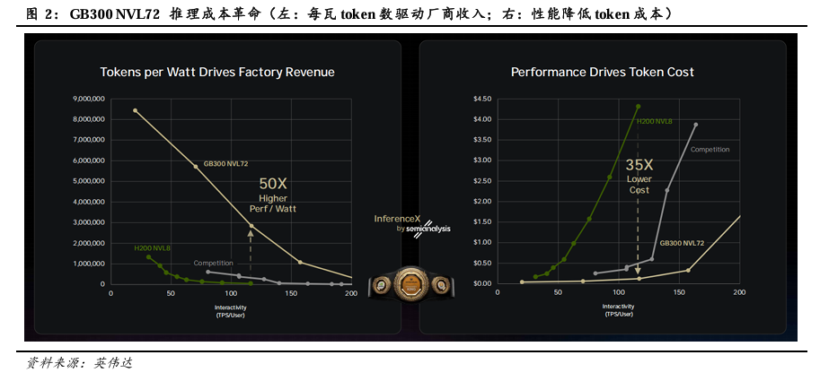 新产品推动推理成本革命。下图左“Tokens per Watt Drives Factory Revenue”所示,随着用户端TPS(Tokens per Second)的增长,同一系统TPW(Tokens per Watt)逐渐下降。下图右“Performance Drives Token Cost”所示,随着用户端TPS的增长,单Token的产出成本逐渐增长。在实现相同TPS的情况下,GB300 NVL72的表现显著优于H200 NVL8及所示竞品。当用户端TPS持续走高时,H200 NVL8及竞品的单瓦产出趋向于0;Token成本则快速上升,大幅高于GB300 NVL72。
