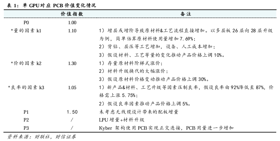 3)良率的因素,AI PCB新产品更迭&材料、工艺升级,可能降低产线良率,假设良率由92%降低至87%,价格对应上涨5.75%,假设良率因素推动产品价格上调5%。
