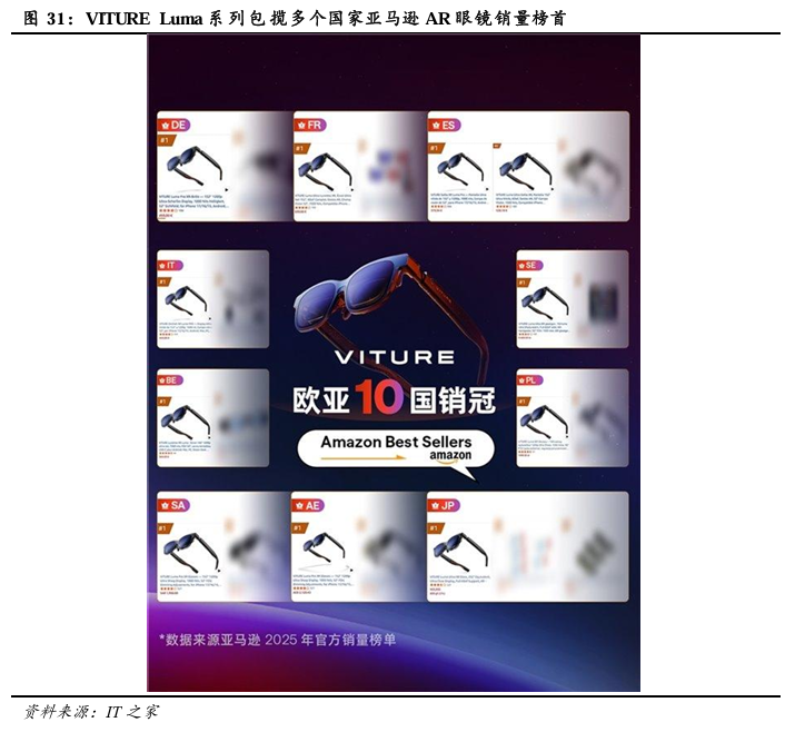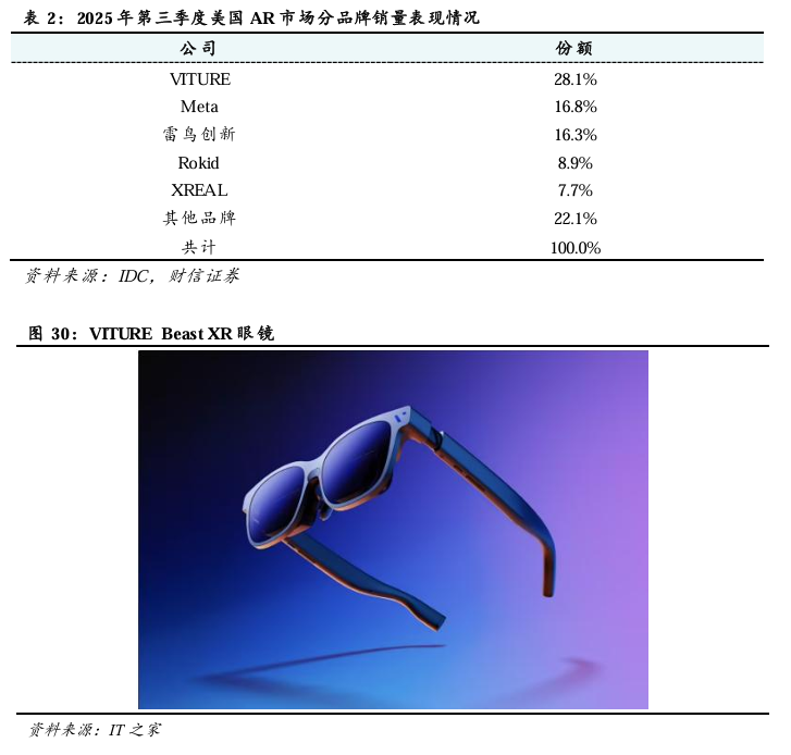 市场与资本双重认可下,VITURE确立全球高端XR眼镜领军地位。继2025年9月融资1亿美元后,VITURE于2026年2月再次完成1亿美元融资,半年内融资总额超2亿美元。据IDC报告显示,得益于VITURE Luma系列XR眼镜的上市,VITURE以近三分之一的市场份额稳居2025年第三季度美国AR市场销量冠军,并成为首个进驻美国百思买(Best Buy)的XR品牌。亚马逊官方数据显示,VITURE Luma系列在多个市场表现亮眼,包揽日本、德国、法国、西班牙、意大利、沙特阿拉伯等欧亚10国亚马逊AR眼镜销量榜首。2026 GTC大会亮相的年度旗舰新品VITURE Beast XR眼镜,进一步强化了其产品竞争力,该产品搭载58°超大视场角、内置原生3DoF、120Hz高刷新率、1250尼特超高亮度以及9档无极电致变色等硬核配置,将VITURE长期自研的SpaceWalker软件能力发挥到极致,实现了iPhone与Android手机端无缝多屏体验、电脑端低延迟多屏扩展等创新功能,覆盖游戏观影、移动办公等多场景需求,进一步完善了VITURE高端产品矩阵,强化了其在消费级与专业级市场的双线布局。