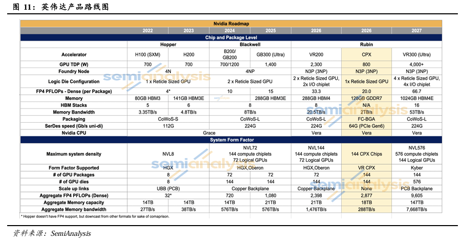 Vera Rubin NVL72与LPX有望在2026年实现量产。下图为GTC 2026前的英伟达产品路线图预期,我们此前预计Vera Rubin 200(VR200)有望率先在2026年下半年实现量产,CPX系列在VR200 之后逐步起量,VR300(Ultra)在2027年实现量产。考虑GTC 2026大会上英伟达未对CPX做进一步介绍,而在Rubin平台中加入Groq 3 LPX,并声明相关芯片均已投入生产。我们调整对英伟达产品路线的预期,预计Vera Rubin NVL72有望率先在2026年实现量产,LPU在2026年下半年逐步起量,Rubin Ultra在2027年实现量产。
