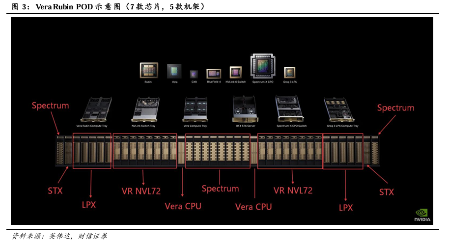 5种机架分别为:1)Vera Rubin NVL72机架,集成了通过NVLink 6互连的72个Rubin GPU和36个Vera CPU,并配备了ConnectX-9 SuperNIC与BlueField-4 DPU,与Blackwell平台相比,VR NVL72仅需四分之一的GPU即可训练大型混合专家模型,每瓦特推理吞吐量最高可提升10倍,每Token成本为十分之一。2)Vera CPU机架,单机架集成256个Vera CPU,性能表现比传统CPU效率提升1倍,速度提升50%。3)Groq 3 LPX机架,搭载256个LPU处理器,配备128GB片上SRAM和640 TB/S的纵向扩展带宽。LPU专为智能体系统的低延迟和长上下文需求而设计,LPX与Vera Rubin协同部署有望为AI供应商拓展营收机遇。LPX机架预计将在2026年下半年面世。4)BlueField-4 STX存储机架,作为AI原生存储基础设施,可在整个POD中无缝扩展GPU内存。5)Spectrum-6 SPX 以太网机架,专为加速AI工厂“东西向”流量而设计,可灵活配置Spectrum-X以太网交换机或NVIDIA Quantum-X800 InfiniBand 交换机,能够在大规模部署中提供低延迟、高吞吐量的机架间互连。
