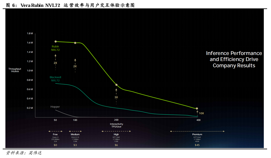 Vera Rubin NVL 72在Premium场景下表现优异。下图纵轴为TPS/MW,反映AI工厂的运营效率;横轴为TPS/User,反映用户实际交互体验或效用。图中英伟达将TPS/User划分为Free、Medium、High、Premium四个层级。1)Free,以极低成本实现大规模用户覆盖,例如Qwen 3(235B参数、32K上下文),50 TPS/User;2)Medium,支持每月约 3 美元的订阅收费,典型如Kimi K2.5(1 Trillion 参数,128K上下文)、100 TPS/User,平衡成本与性能;3)High,支持每月约6美元的收费,典型为2 Trillion参数大模型 + 128K上下文,200 TPS/User,针对更高价值场景;4)Premium,支持每月约45美元的高额收费,典型为 2 Trillion 参数大模型 + 400K 超长上下文,400 TPS/User,面向极致交互、低延迟、深度推理的AI 需求。