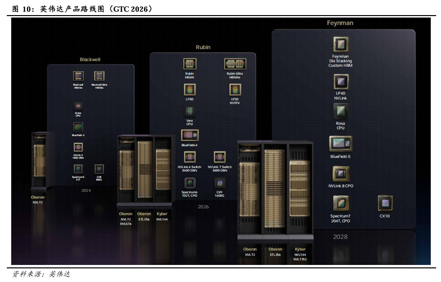 GTC 2026 黄仁勋演讲回顾:1)预计Blackwell与Rubin产品在2025-2027年实现收入约10000亿美元,此前在GTC 2025上预期Blackwell与Rubin产品在2025-2026年实现收入约5000亿美元,英伟达收入有望在2026-2027年实现高速增长。2)发布Vera Rubin POD,引入LPX机架。Vera Rubin POD由16*Vera Rubin NVL72机架+10*Spectrum-6 SPX 以太网机架+10*Groq 3 LPX机架+2*Vera CPU机架+2*BlueField-4 STX存储机架组成。其中Groq 3 LPX 机架,搭载256个LPU处理器,配备128GB片上SRAM和640 TB/S的纵向扩展带宽。LPU专为智能体系统的低延迟和长上下文需求而设计,LPX与Vera Rubin协同部署有望为AI供应商拓展营收机遇。LPX机架预计将在2026年下半年面世。3)推理市场分级,高性能服务器触及更多市场。将需求划分为Free、Medium、High、Premium、Ultra等场景,Rubin NVL72、Rubin NVL72+LPX等高性能服务器能够触及更多高付费意愿场景,从而可实现更高收入规模。每GW的Blackwell、Rubin、Vera Rubin NVL72+LPX AI工厂的年营收潜力分别为300、1500、3000亿美元。4)发布产品路线图。Rubin平台预计在2026年问世,机架形式有望从Blackwell平台的Oberon NVL72拓展至Oberon NVL72、NVL576,Oberon ETL256,Kyber NVL144。Feynman平台预计在2028年问世,机架形式预计为Oberon NVL72,Oberon ETL256,Kyber NVL144、NVL1152。
