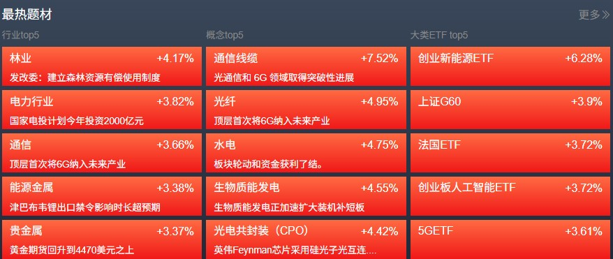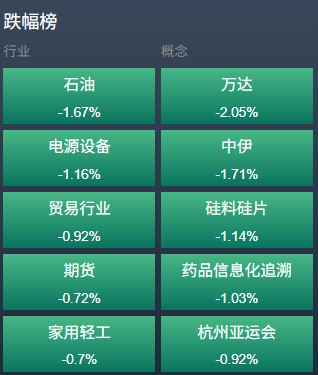 热点明显扩大。其中,绿电概念股持续爆发,十余股涨停。光通信概念股走强,算力概念活跃,军工板块午后走强。下跌方面,油气股调整,光伏设备、燃气等板块小幅下跌。