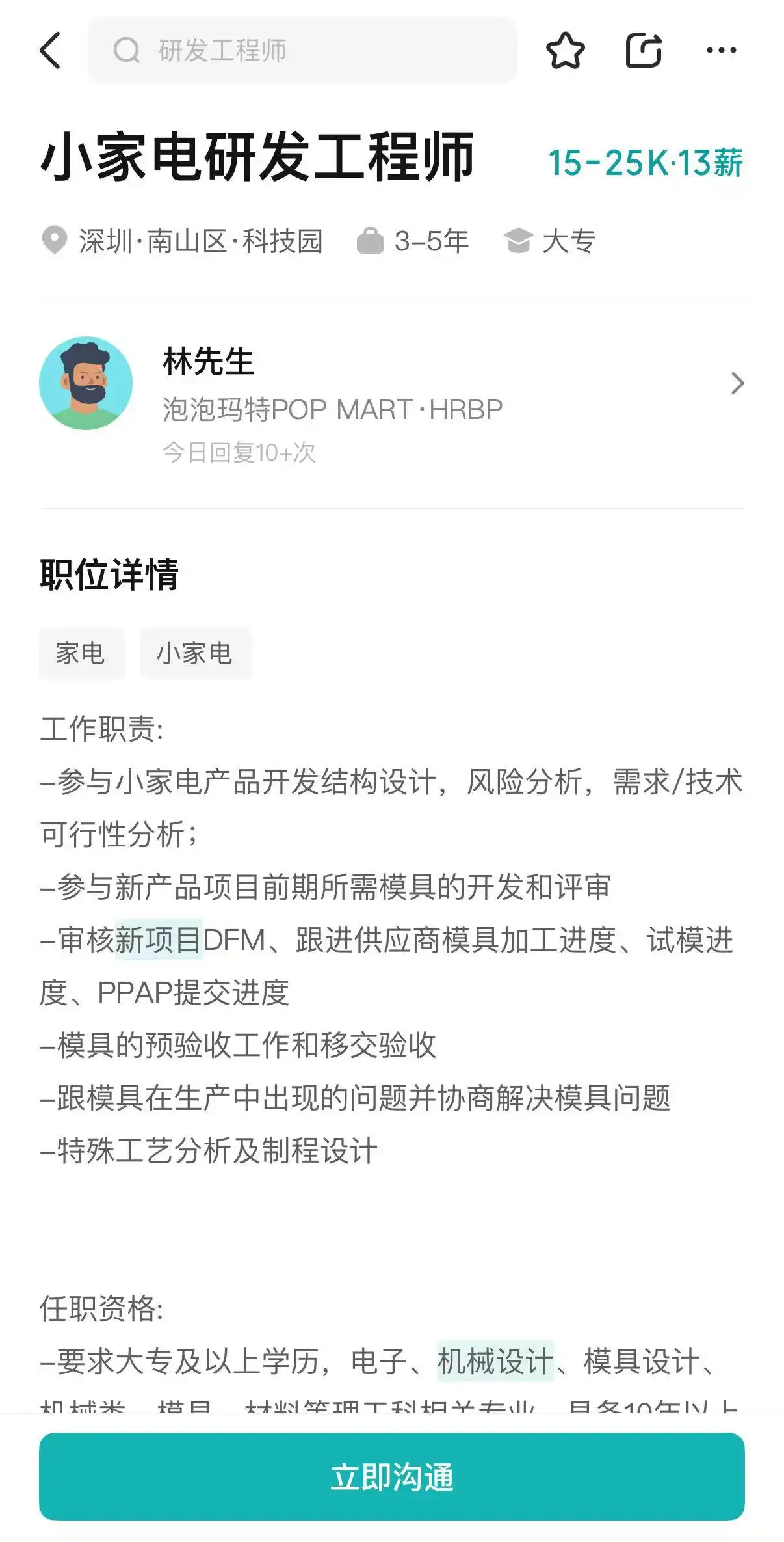 2025年6月,观察者网就曾报道过泡泡玛特公开启动家电相关人才招聘的消息,涉及小家电采购主管、品质专家、研发工程师等岗位,部分岗位要求具备冰箱、咖啡机、早餐机、电水壶等相关经验,项目被标注为A+级大投入,招聘覆盖深圳、东莞、上海、广州等地,薪资区间15000-45000元。