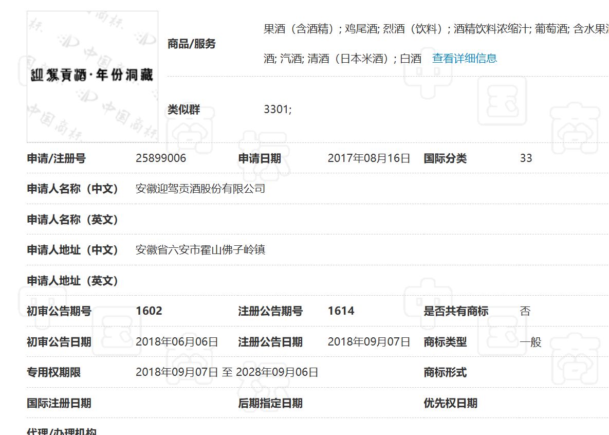 3月26日,每经记者在中国商标网查询到,目前,迎驾贡酒拥有“迎驾洞藏”“迎驾贡酒年份洞藏”等含有“洞藏”二字的商标。
