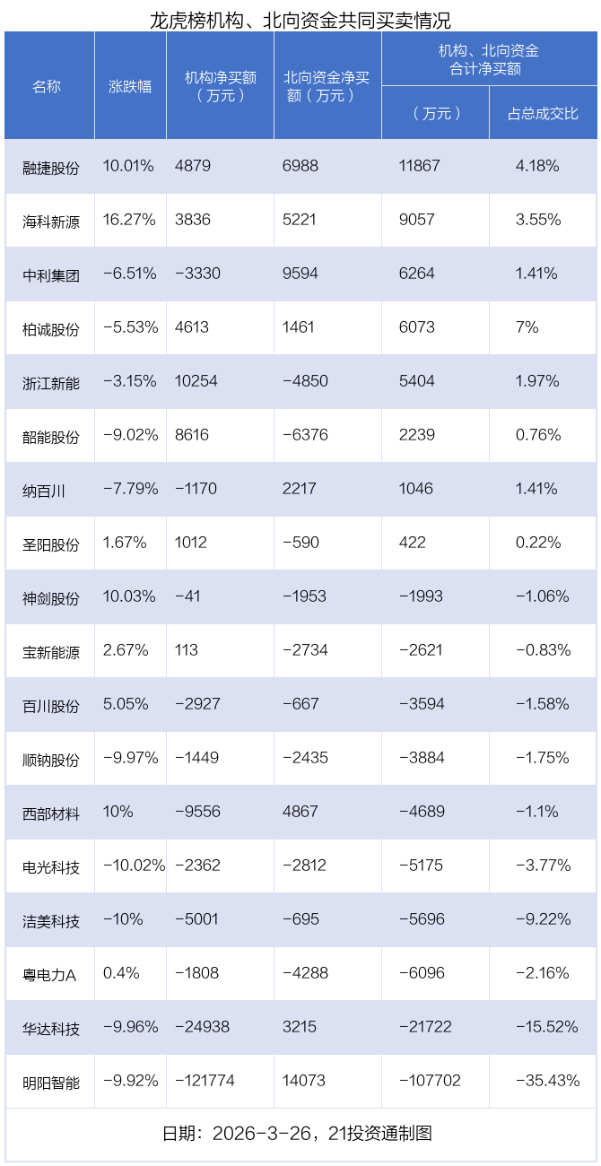 值得注意的是,机构和北向资金共同净买入了融捷股份、海科新源、柏诚股份等3股;共同净卖出了百川股份、洁美科技、神剑股份、顺钠股份、电光科技、粤电力A等6股;在明阳智能,中利集团,西部材料,华达科技,纳百川,圣阳股份,宝新能源,浙江新能,韶能股份上出现分歧,机构净卖出明阳智能12.18亿元,北向资金净买入1.41亿元;机构净卖出中利集团3330.2万元,北向资金净买入9594.15万元;机构净卖出西部材料9556.08万元,北向资金净买入4866.8万元;机构净卖出华达科技2.49亿元,北向资金净买入3215.5万元;机构净卖出纳百川1170.39万元,北向资金净买入2216.53万元;机构净买入圣阳股份1011.9万元,北向资金净卖出589.75万元;机构净买入宝新能源113.23万元,北向资金净卖出2734.49万元;机构净买入浙江新能1.03亿元,北向资金净卖出4849.68万元;机构净买入韶能股份8615.68万元,北向资金净卖出6376.41万元。