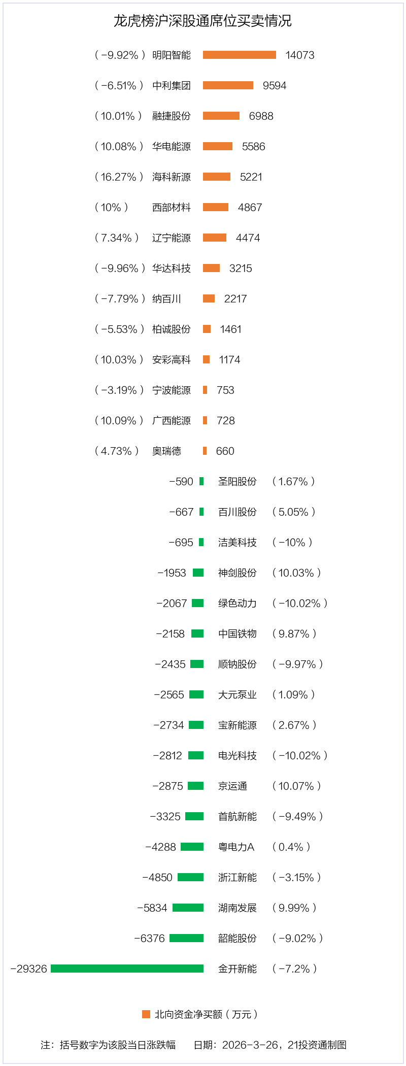 3月26日,北向资金参与龙虎榜中的个股共有31只,合计净卖出1.45亿元。其中沪股通净买入9 股,净卖出5 股,合计净卖出9558.18万元;深股通净买入5 股,净卖出12 股,合计净卖出4980.61万元。