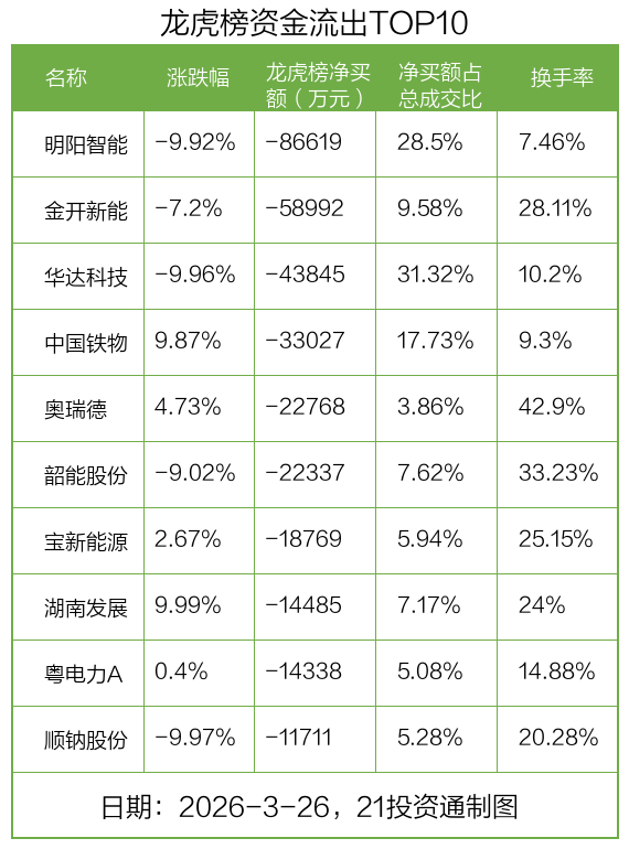而龙虎榜中资金净流出最多的是明阳智能(601615.SH),被净卖出为8.66亿元,占总成交金额的28.5%。明阳智能收盘下跌9.92%,换手率为7.46%。
