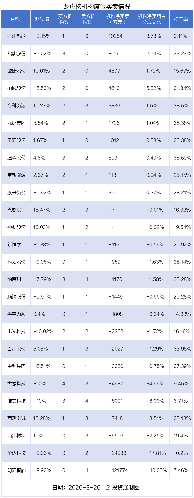 3月26日,26只个股龙虎榜出现了机构的身影,机构合计净卖出15.19亿元。具体来看,机构净买入10股,净卖出16股。