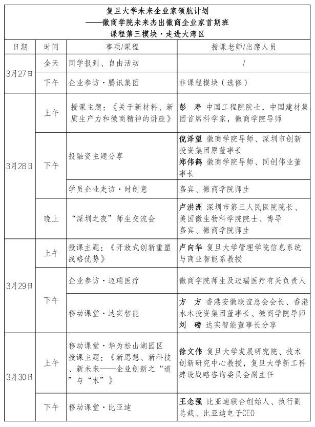 上证报中国证券网讯(记者 孔令仪)记者获悉,3月28日至3月30日,复旦大学未来企业家领航计划——上海徽商学院“未来杰出徽商企业家”首期班(以下简称“首期班”)将在大湾区扬帆起航,开启第三模块课程。本次课程以“徽聚湾区·新质领航”为主题,将带领学员走进“创新之城”深圳,对话院士专家、商界领袖、投资翘楚,深度碰撞思想火花。