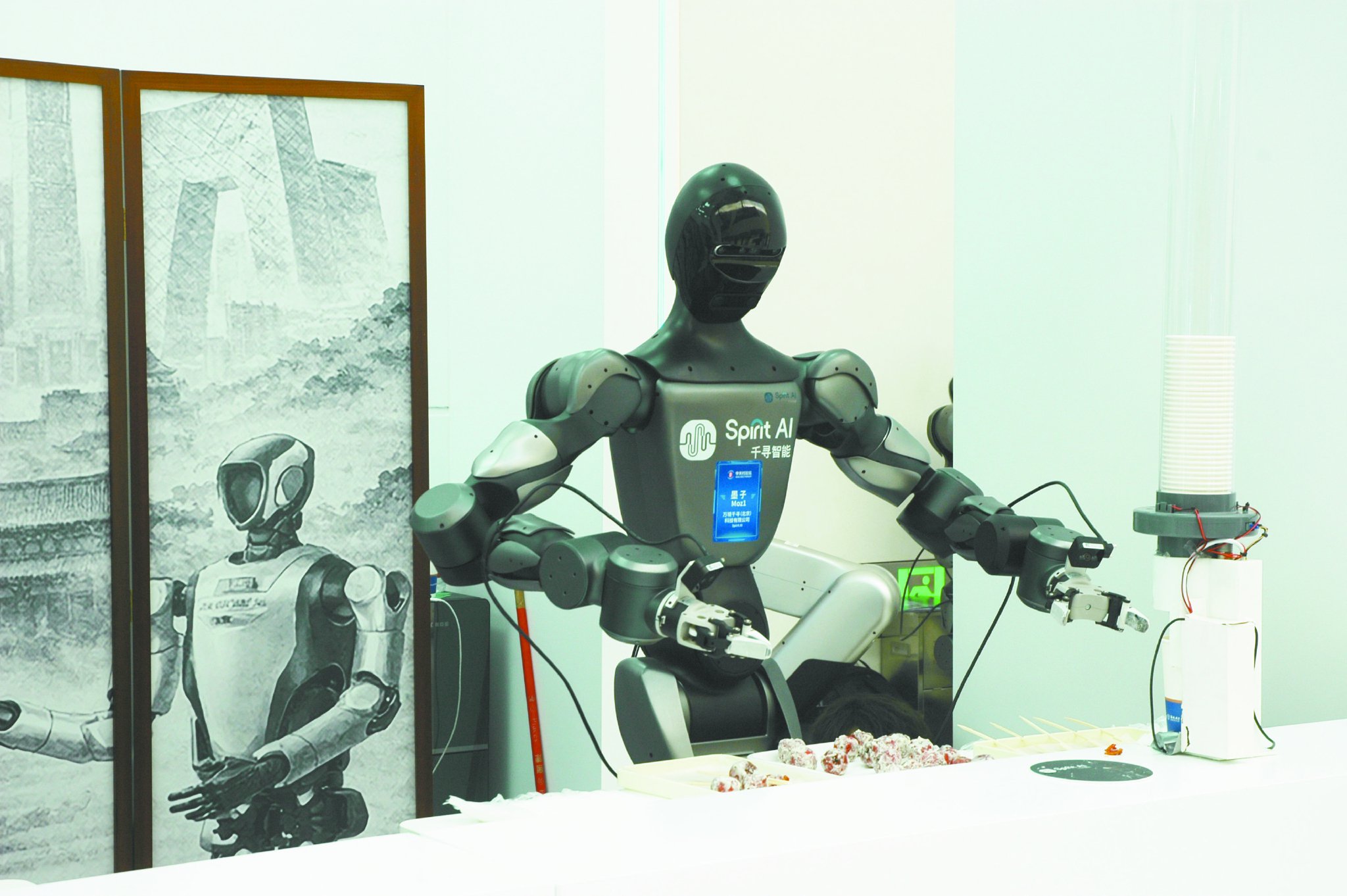 尤其值得一提的是,机器人还能现场表演串糖葫芦。据乐聚机器人具身操作算法总监王强介绍,凭借全身柔性力控技术,它首次实现不依赖遥操完成自主穿刺。机器人需要实时根据糖葫芦的大小和形状,调整机器手拾取糖葫芦的力度和方位,才能完成这个看似简单的动作,这一动作对于机器人的精细控制能力要求非常高。另一个调制饮品的机器人也不简单,它除了能够自主完成拾取纸杯、开盖等动作外,还能在倒带气饮料时及时控制泡沫。
