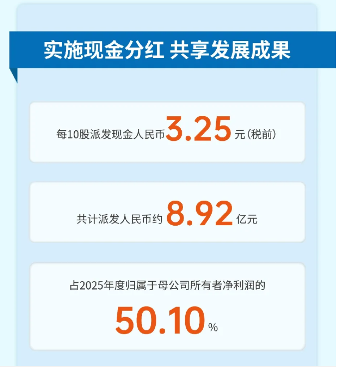 根据公司公告,2025年度公司拟向全体股东每10股派发现金红利3.25元(含税),按2025年12月31日总股本计算,合计拟派发现金红利约8.92亿元。本次现金分红金额占本年度归属于上市公司股东净利润的比例达到50.10%。