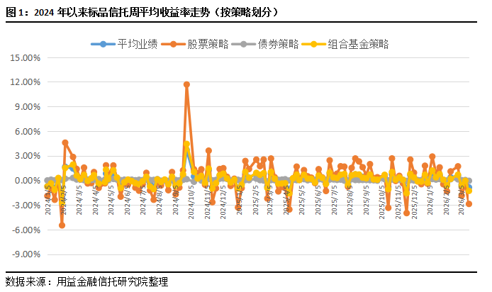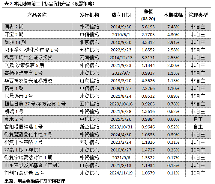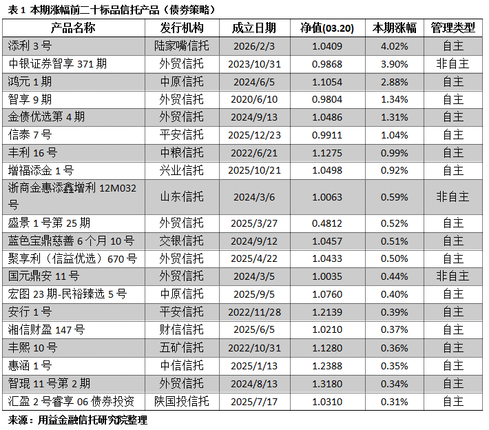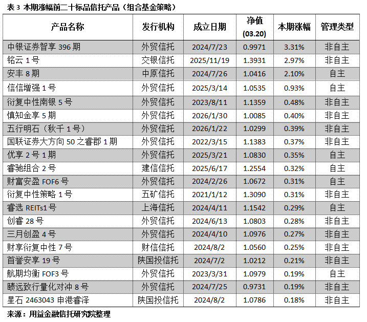 对本期(2026.03.14-2026.03.20)披露净值数据的标品信托产品进行统计汇总,按照债券策略、股票策略、组合基金策略和其他策略等四大投资策略进行分类,并对各投资策略的产品期间收益率进行排名: