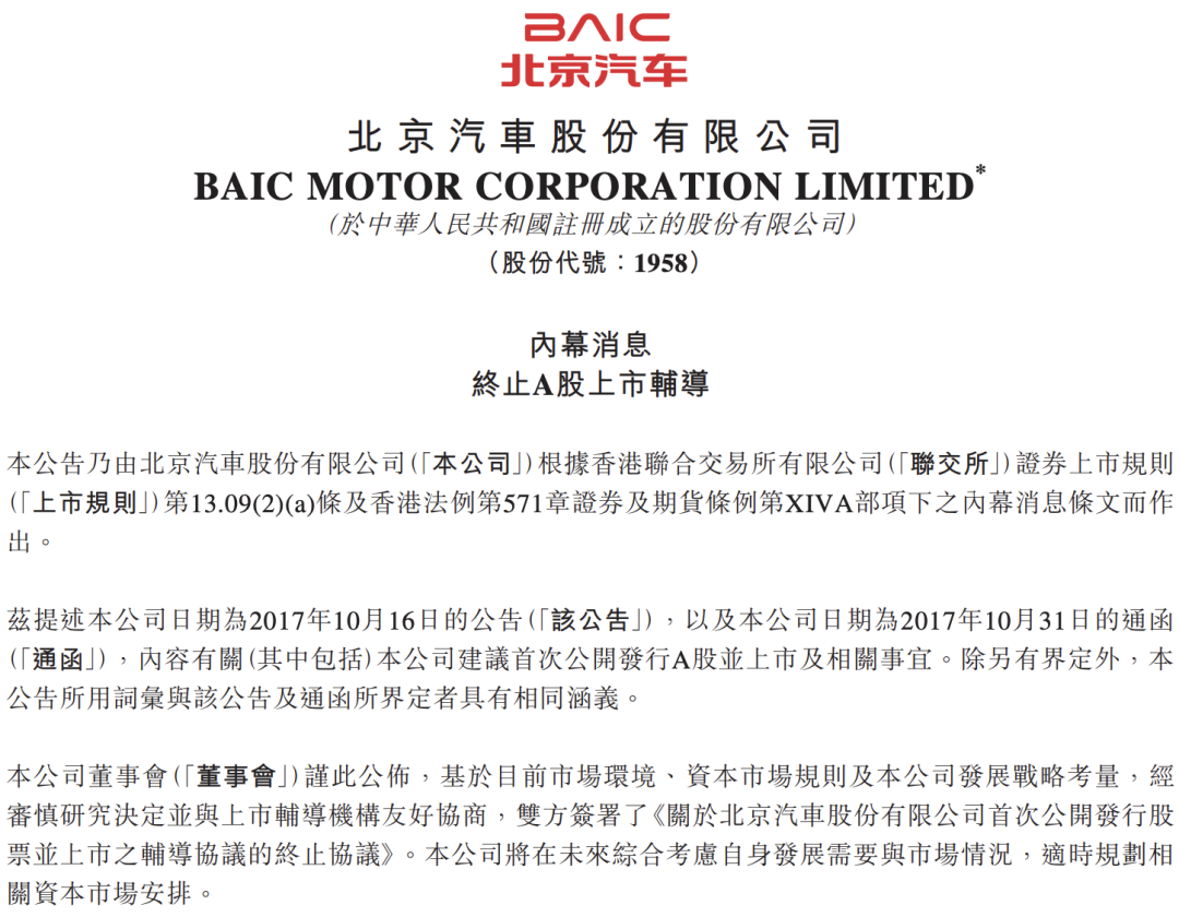 3月25日,北京汽车股份有限公司(简称:北京汽车/BAIC MOTOR)发布公告显示,公司终止A股上市辅导。