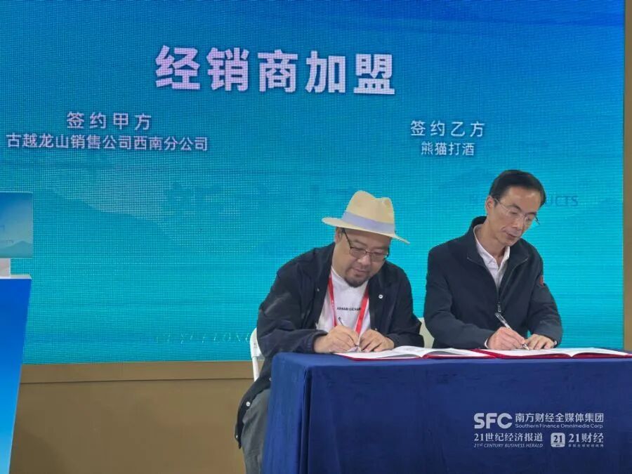 (熊猫打酒创始人程建军与古越龙山西南分公司总经理朱国安签约)