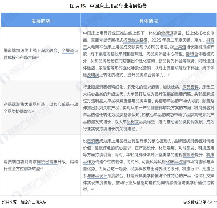 中国床上用品行业正从渠道、产品、消费需求端开启全方位升级发展,渠道端加速线上线下深度融合,线上依托社交电商、直播带货等新模式实现成交额稳步增长,线下向品牌体验中心转型并强化场景化营销,全渠道运营成为核心布局方向;产品端顺应消费者需求精细化多元化趋势,加快枕头、床品套件、床垫三大核心品类升级,大单品打法成为行业主流;消费端受悦己消费主导,需求从基础功能向情绪价值、睡眠疗愈与卧室美学价值升级,企业围绕这一趋势在产品设计、材质、功能、科技等方面持续创新,推动行业从基础功能供给向情感与美学价值供给转型。