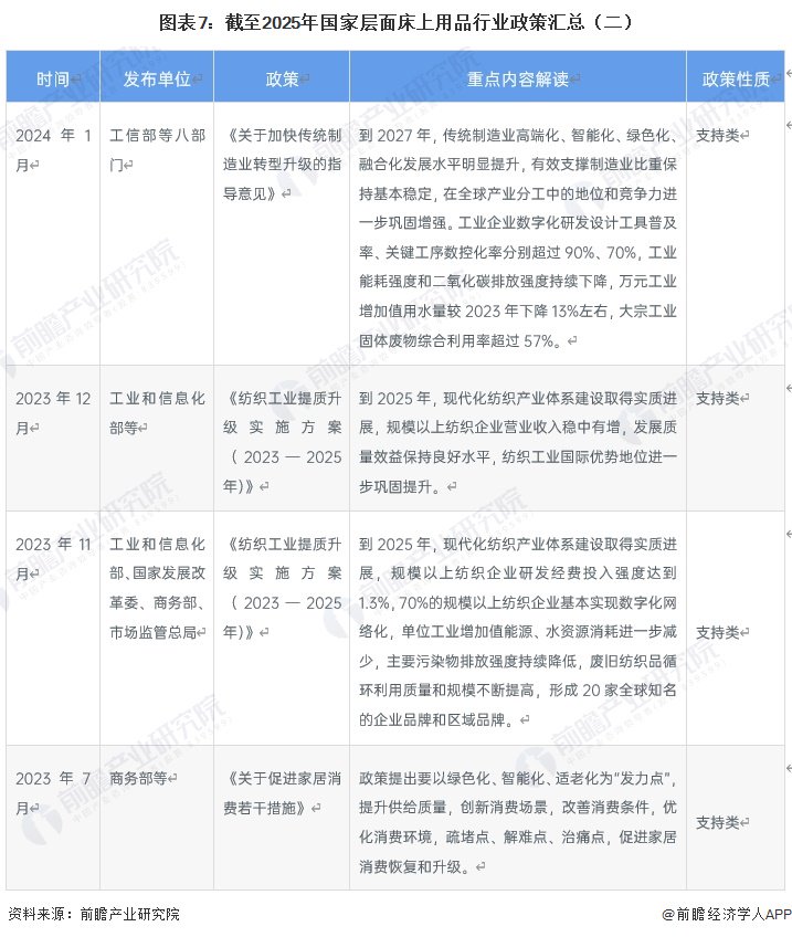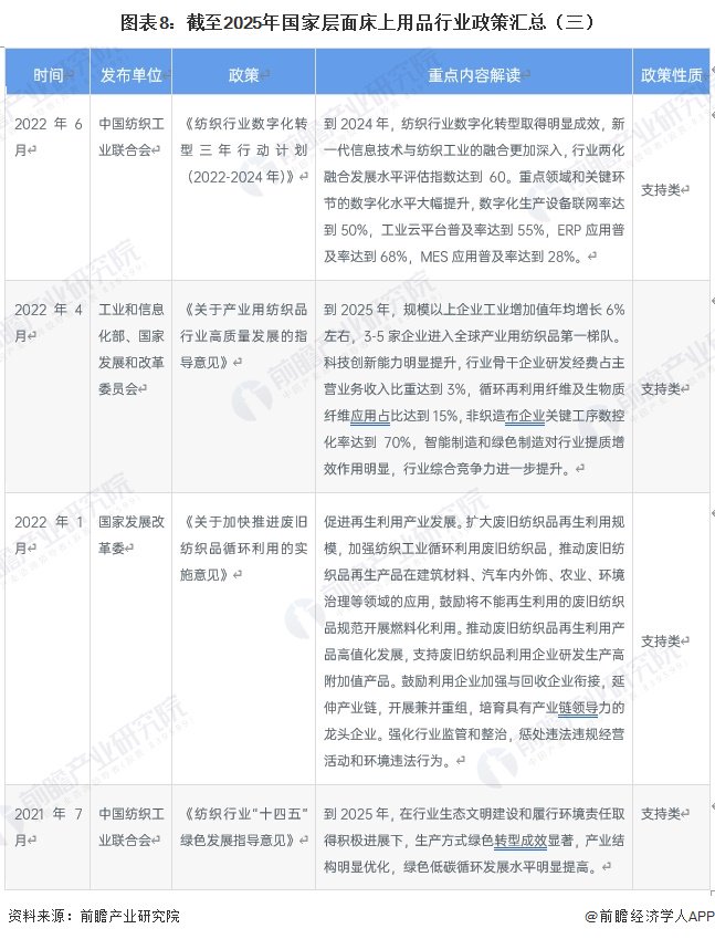 国家层面床上用品行业政策由工信部、市场监管总局等多部门协同发力。政策主线从初期聚焦绿色低碳与废旧纺织品循环利用,逐步延伸至数字化转型、智能家居与适老化创新,通过《纺织工业提质升级实施方案》《轻工业稳增长工作方案》等系列文件,明确数字化研发设计工具普及率、单位能耗下降等量化目标,培育千亿级特色产业集群与全球知名品牌,推动行业从传统制造向高端化、智能化、绿色化融合发展转型,实现产业规模稳定增长与价值链持续跃升。