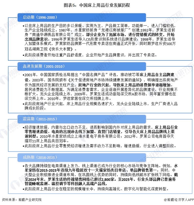 中国床上用品行业在过去三十年间,完成了从基础必需品到现代品牌消费品的深刻转型。其发展脉络清晰地分为四个阶段:在启动期(1996-2000),行业从生产导向转向品牌启蒙,企业通过建立专卖店和大众营销,初步建立了市场意识;进入高速发展期(2001-2010),在房地产繁荣和消费升级的推动下,行业规模快速扩张,龙头品牌借助资本市场力量,实现了全国化布局与品牌化运营;随后经历震荡期(2011-2015),宏观经济与电商渠道的冲击促使行业进行深刻调整,主流品牌成功完成线上转型,开辟了新的增长赛道;当前的成熟期(2016-2025),行业进入全渠道融合与价值创新阶段,竞争焦点从渠道扩张转向以智能化、高端化、数字化为核心的深度竞争,头部企业致力于从产品制造商向“睡眠解决方案”服务商转型。