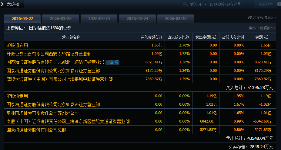 奥瑞德(600666)今日涨停,成交额61.20亿元,换手率43.05%,盘后龙虎榜数据显示,沪股通专用席位买入1.65亿元并卖出1.19亿元。开源证券西安太华路净买入1.05亿元。