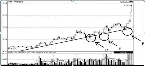 在D、E和F处,股价受到上升趋势线的支撑而止跌加升,所以这3处都是不错的加仓点。