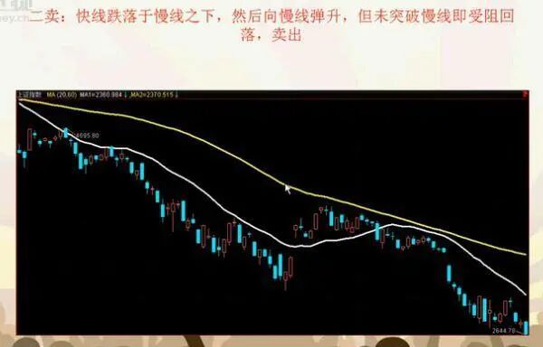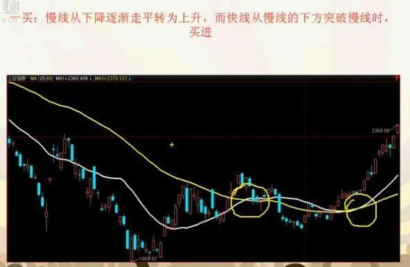 一买:慢线从下降逐渐走平转为上升,而快线从慢线的下方突破慢线时,买进。