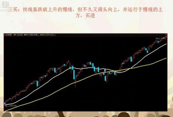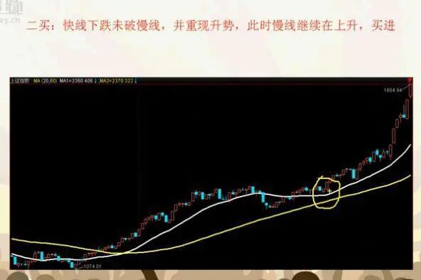 二买:快线下跌未破慢线,并重现升势,此时慢线继续上升,买进。