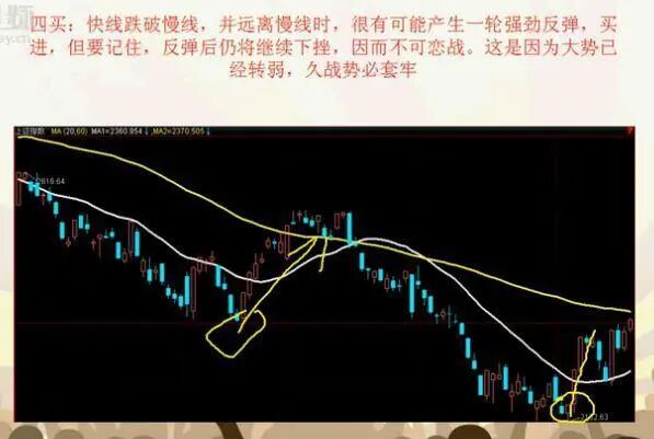 四买:快线跌破慢线,并远离慢线时,很有可能产生一轮强劲反弹,买进,但要记住,反弹后仍将继续下挫,因而不可恋战。这是因为大势已经转弱,久战势必套牢。