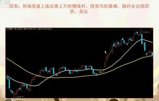 四卖:快线急速上涨远离上升的慢线时,投资风险激增,随时会出现回跌,卖出