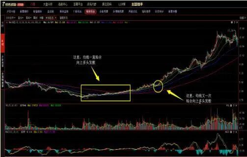 3、均线粘合向上发散是好事,但是较长期的均线也参与到粘合中来,更加是好事。